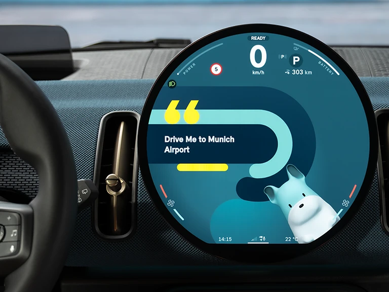 Mit dem serienmäßigen MINI Intelligent Personal Assistant steuerst du Funktionen wie Navigation, Telefon, Radio, Temperatur und Reiseinformationen ganz einfach per Sprache. Sage einfach „Hey MINI“ oder drücke die Sprechtaste am Lenkrad, um ihn zu aktivieren. Ein besonderes Highlight ist die Auswahlmöglichkeit zwischen zwei Avataren für deinen persönlichen Assistenten: eine stilisierte Version deines MINI oder den im MINI Connected Package verfügbaren Maskottchen "Spike", der gegen Aufpreis erhältlich ist.